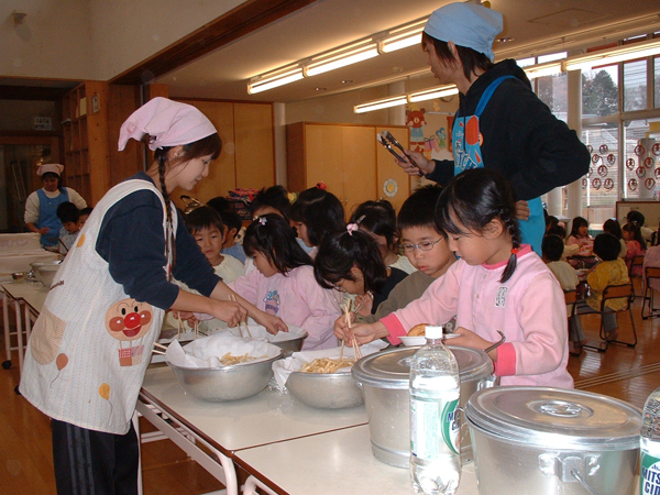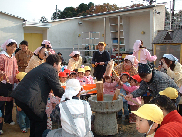 「うす」と「きね」を使って昔ながらのおもちつきをしました。祖父母の皆さんにもお手伝いいただき、おいしいおもちができあがりました。お部屋で、できたてのきなこもちとあんころもちを食べました。とってもおいしかったですね。
