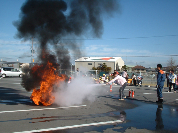 もし火事が起こったら・・・を想定して、保育士が実際に消化器を使って火を消す訓練を行いました。子どもたちは防火ビデオをみせていただいた後、消防士さんと『火遊びはしません』と、大切な約束をしました。火事を起こさないよう気をつけましょう。