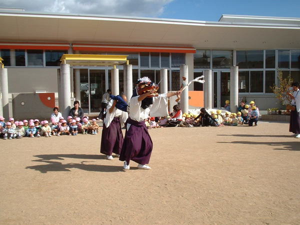 獅子舞が園にやってきました。みんなの健やかな成長を願った舞ってくださいました。恐い顔の獅子舞に泣いてしまうお友だちもたくさんいました。
