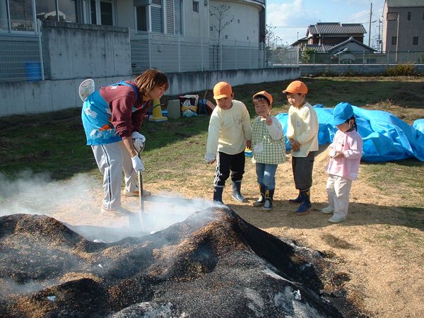 みんなで育て収穫したさつまいもを、もみがらで焼いて食べました。焼きたてのホカホカのお芋を美味しそうに食べる子どもたちでした。