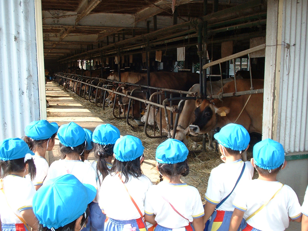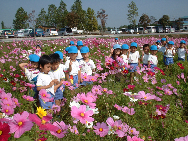 ひまわりの丘公園では、大きな遊具で思いっきり遊んだ後、コスモス畑に行きました。同じくらいの背の高さのコスモスの間をくぐりぬけ、十分に秋を感じることができました。お弁当後は共進牧場まで足を伸ばしました。大きな牛に驚きながらも「いつも美味しい牛乳をありがとう」とお礼を言う姿も・・・(~o~)