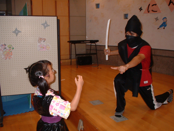 室内のコーナーでは、先生たち手作りの『にんじゃdeドロロンパ』の遊ぶコーナーがありました。子どもたちも忍者に変身して忍者屋敷に突入!!手裏剣で敵を倒したり、ジャンケンに勝たないと次に進めなかったり…たくさんの試練を乗り越えていかなければいけないのですが…、子ども忍者たちはへっちゃらのようでした!(^^)!