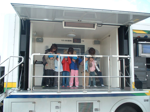 起震車に乗って強い地震を体験しました。正しい避難の方法を消防士さんから教わり改めて命を守る大切さを知った子どもたちです。