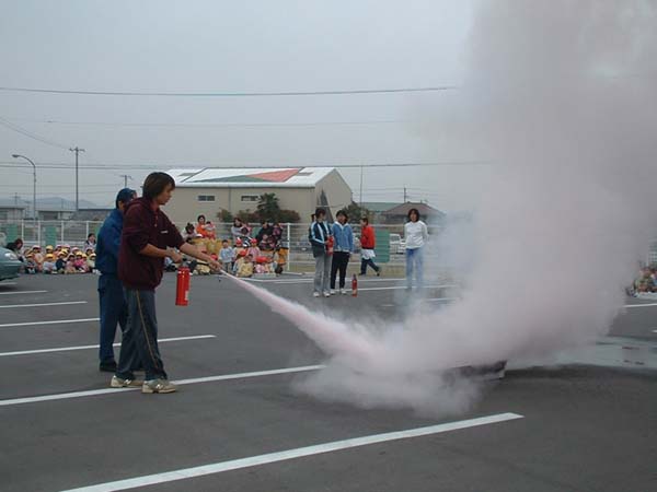 幼年消防活動の一環で消火訓練を行いました。消防士さんに火災の避難訓練の様子を見て頂き、その後消火器を使用して消火訓練を行いました。防火ビデオも見せて頂き、消防士さんと「火遊びはしません」としっかと約束をしました。