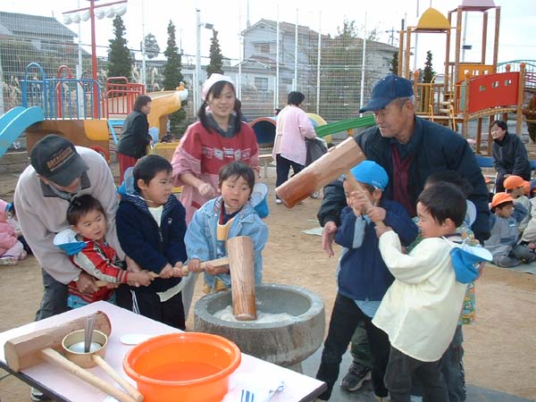 祖父母の皆さんと一緒に、昔ながらのおもちつきを楽しみました。つきたてのおもちはとってもおいしかったね(^o^)