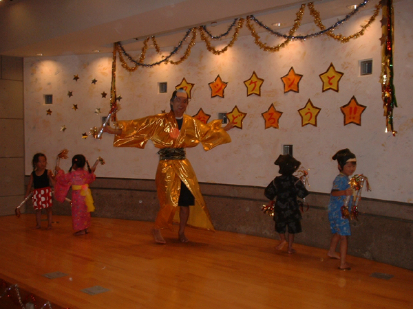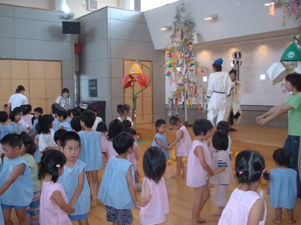 七夕会を行いました。各クラス毎に歌を発表した後、七夕のお話を聞き、ゲームをしました。織り姫と彦星の登場には大騒ぎの子どもたち!!残念ながら、夜は曇り空で、天の川はみることができませんでしたが、みんなの心の中で2人は出会えたことと思います。翌日、笹流しをしました。お願い事がかなうよう立ち上る煙をみつめる子どもたちでした。