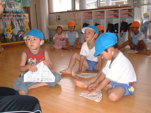 広告で紙でっぽうをつくりました。作り方を聞く顔は、真剣そのもの!!「ぱぁん」と上手くならせることができるかな?
