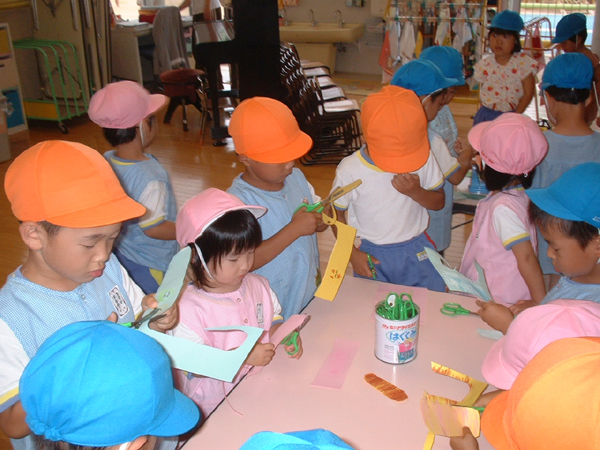 飛行機をつくりました。お絵かき・はさみ・はり付け・・・とたくさんの作業ですが、大きい子は小さい子に手をさしのべながら、協力してつくり上げました。