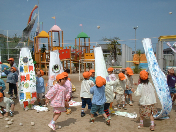 戸外に出て、たくさんのこいのぼりにおやつ(玉入れです)をあげるゲームを楽しみました。(^o^)