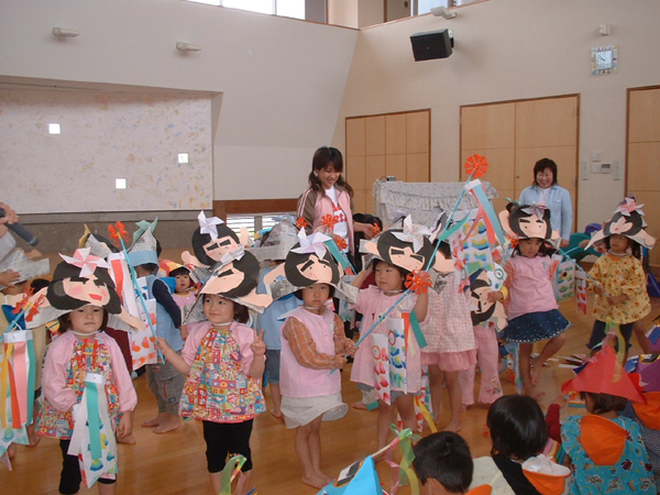 5月5日の子どもの日を前に、子どもの日のお祝い会を開きました。手作りのこいのぼりとかぶとを持ってうれしそうな子どもたちでした。おやつには、かしわもちを頂きました。