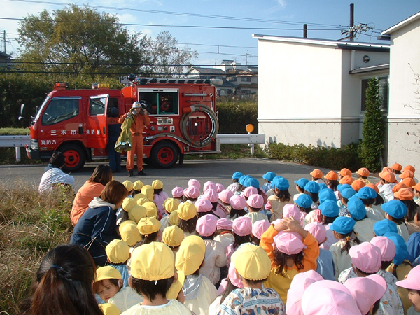 ポンプ消防車が保育園にやってきました。消防車のしくみを消防士さんに教えて頂きました。