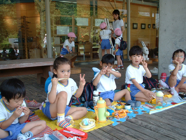 お昼は、青空の下みんなでおいしいお弁当をいただきました。 たまごやきやウィンナー☆おにぎりにフルーツたくさん食べて元気もりもり!!
