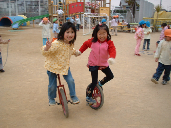 ひまわりぐみの女の子を中心に一輪車に乗れるようになった子が増えました。運動場を一周するのは、楽々です。すみれ・きくぐみのお友だちもひまわりさんに負けじと練習中です!!