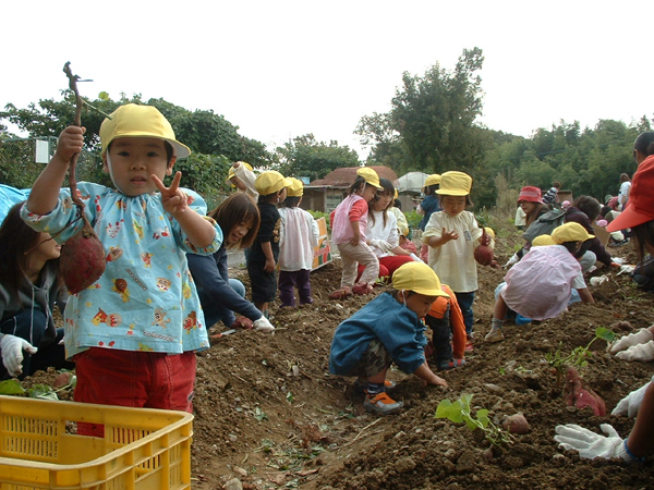 年長さんが一生懸命育てたサツマイモの収穫の日がきました。予想通り見事な芋で、こどもたちは大喜び。