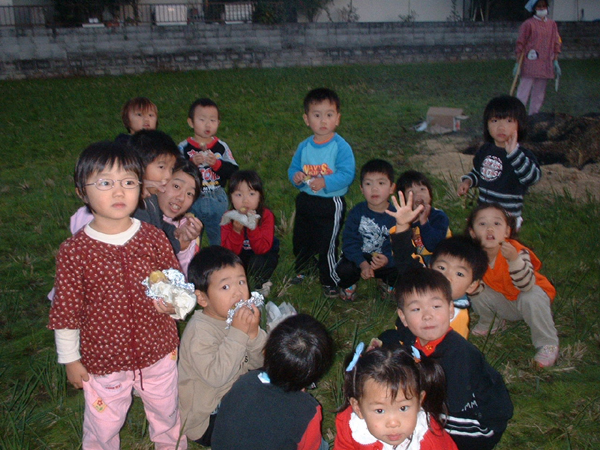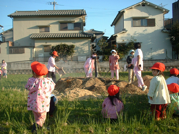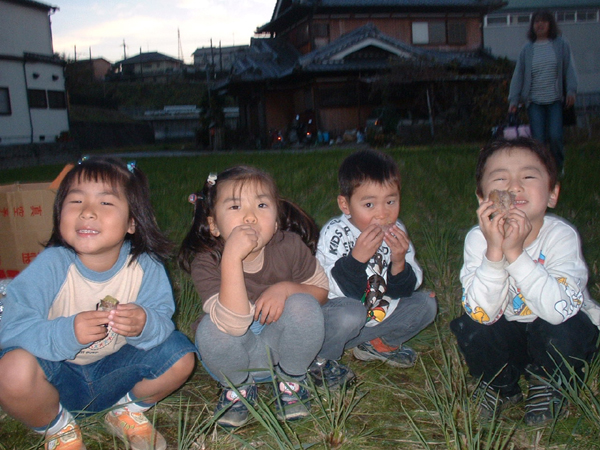 みんなで掘ってきたサツマイモを、前日から火をつけておいたもみがらの中に入れて焼きました。 待っている間に、田圃の中でリレーをしたり綱引きをしたりしてみんなで遊びました。 風がなくて、もみがらが焼けるのに時間がかかり、こどもたちの食べる時間がずいぶんおそくなってしまいました。
